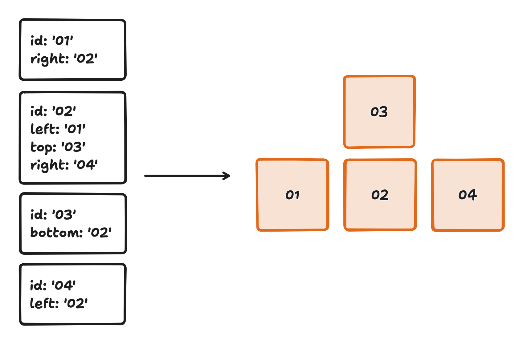 ); } ``` In React Flow, nodes can have data stored on them that can be used during rendering. In this case we're storing the markdown content to display by adding a `source` property to the `SlideData` type and passing that to the `` component. We can update our hardcoded nodes with some markdown content to see it in action: ```tsx filename="App.tsx" {2, 10-27, 34} import { ReactFlow } from '@xyflow/react'; import { Slide, SLIDE_WIDTH } from './Slide'; const nodeTypes = { slide: Slide, }; export default function App() { const nodes = [ { id: '0', type: 'slide', position: { x: 0, y: 0 }, data: { source: '# Hello, React Flow!' }, }, { id: '1', type: 'slide', position: { x: SLIDE_WIDTH, y: 0 }, data: { source: '...' }, }, { id: '2', type: 'slide', position: { x: SLIDE_WIDTH * 2, y: 0 }, data: { source: '...' }, }, ]; return ; } ``` Note that we've added the `minZoom` prop to the `` component. Our slides are quite large, and the default minimum zoom level is not enough to zoom out and see multiple slides at once. In the nodes array above, we've made sure to space the slides out by doing some manual math with the `SLIDE_WIDTH` constant. In the next section we'll come up with an algorithm to automatically lay out the slides in a grid. #### Laying out the nodes We often get asked how to automatically lay out nodes in a flow, and we have some documentation on how to use common layouting libraries like dagre and d3-hierarchy in our [layouting guide](/learn/layouting/layouting). Here you'll be writing your own super-simple layouting algorithm, which gets a bit nerdy, but stick with us! For our presentation app we'll construct a simple grid layout by starting from 0,0 and updating the x or y coordinates any time we have a new slide to the left, right, up, or down. First, we need to update our `SlideData` type to include optional ids for the slides to the left, right, up, and down of the current slide. ```tsx filename="Slide.tsx" {3-6} export type SlideData = { source: string; left?: string; up?: string; down?: string; right?: string; }; ``` Storing this information on the node data directly gives us some useful benefits: * We can write fully declarative slides without worrying about the concept of nodes and edges * We can compute the layout of the presentation by visiting connecting slides * We can add navigation buttons to each slide to navigate between them automatically. We'll handle that in a later step. The magic happens in a function we're going to define called `slidesToElements`. This function will take an object containing all our slides addressed by their id, and an id for the slide to start at. Then it will work through each connecting slide to build an array of nodes and edges that we can pass to the `` component. The algorithm will go something like this: * Push the initial slide's id and the position `{ x: 0, y: 0 }` onto a stack. * While that stack is not empty... * Pop the current position and slide id off the stack. * Look up the slide data by id. * Push a new node onto the nodes array with the current id, position, and slide data. * Add the slide's id to a set of visited slides. * For every direction (left, right, up, down)... * Make sure the slide has not already been visited. * Take the current position and update the x or y coordinate by adding or subtracting `SLIDE_WIDTH` or `SLIDE_HEIGHT` depending on the direction. * Push the new position and the new slide's id onto a stack. * Push a new edge onto the edges array connecting the current slide to the new slide. * Repeat for the remaining directions... If all goes to plan, we should be able to take a stack of slides shown below and turn them into a neatly laid out grid! Let's see the code. In a file called `slides.ts` add the following: ```tsx filename="slides.ts" import { SlideData, SLIDE_WIDTH, SLIDE_HEIGHT } from './Slide'; export const slidesToElements = (initial: string, slides: Record) => { // Push the initial slide's id and the position `{ x: 0, y: 0 }` onto a stack. const stack = [{ id: initial, position: { x: 0, y: 0 } }]; const visited = new Set(); const nodes = []; const edges = []; // While that stack is not empty... while (stack.length) { // Pop the current position and slide id off the stack. const { id, position } = stack.pop(); // Look up the slide data by id. const data = slides[id]; const node = { id, type: 'slide', position, data }; // Push a new node onto the nodes array with the current id, position, and slide // data. nodes.push(node); // add the slide's id to a set of visited slides. visited.add(id); // For every direction (left, right, up, down)... // Make sure the slide has not already been visited. if (data.left && !visited.has(data.left)) { // Take the current position and update the x or y coordinate by adding or // subtracting `SLIDE_WIDTH` or `SLIDE_HEIGHT` depending on the direction. const nextPosition = { x: position.x - SLIDE_WIDTH, y: position.y, }; // Push the new position and the new slide's id onto a stack. stack.push({ id: data.left, position: nextPosition }); // Push a new edge onto the edges array connecting the current slide to the // new slide. edges.push({ id: `${id}->${data.left}`, source: id, target: data.left }); } // Repeat for the remaining directions... } return { nodes, edges }; }; ``` We've left out the code for the right, up, and down directions for brevity, but the logic is the same for each direction. We've also included the same breakdown of the algorithm as comments, to help you navigate the code. Below is a demo app of the layouting algorithm, you can edit the `slides` object to see how adding slides to different directions affects the layout. For example, try extending 4's data to include `down: '5'` and see how the layout updates. If you spend a little time playing with this demo, you'll likely run across two limitations of this algorithm: 1. It is possible to construct a layout that overlaps two slides in the same position. 2. The algorithm will ignore nodes that canno